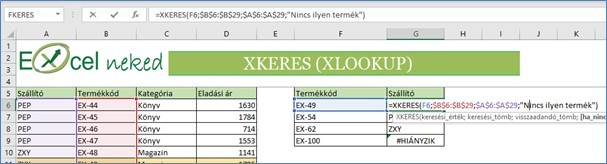 =XKERES(F6;$B$6:$B$29;$A$6:$A$29;”Nincs ilyen termék”)