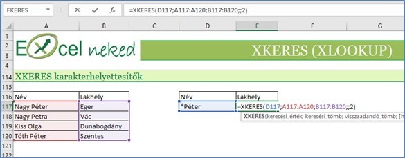 Karakterhelyettesítőket is használhatsz a függvényben, ami nagyon szuper! Például itt Péterre keresek rá, a lakhelyére. Két Péter is szerepel a